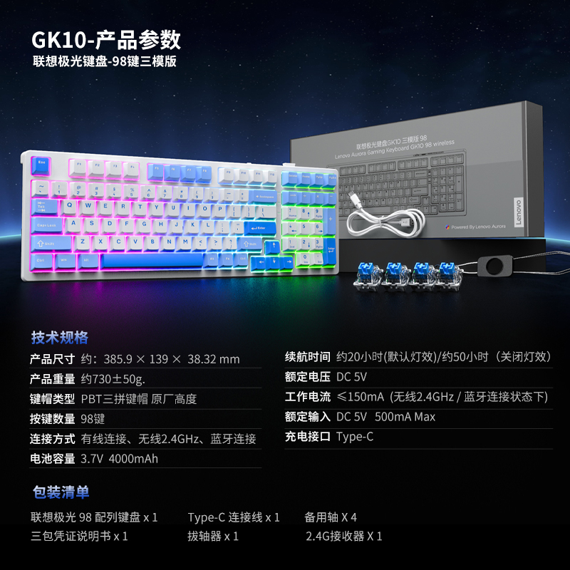 联想GK10三模版98 红轴A款 彩光机械键盘 白兰